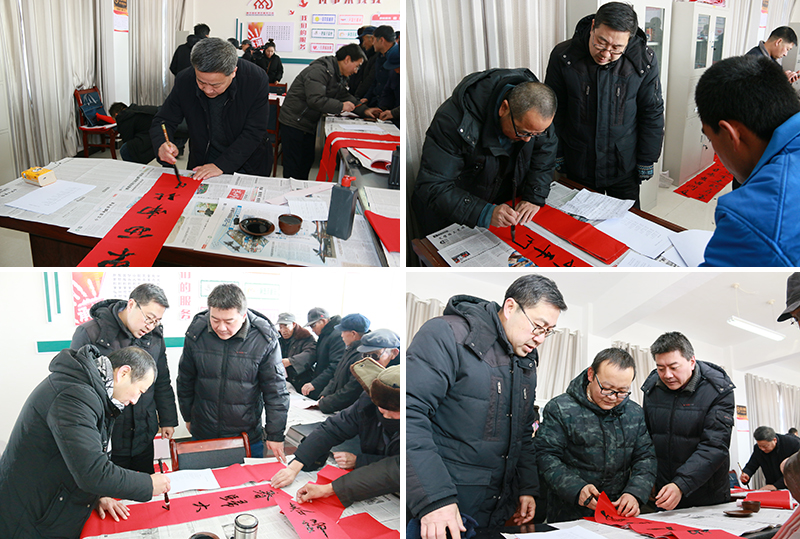 由學院黨委書記、院長趙明和分管幫扶工作副院長王永緒帶隊,一行50余人到達西靖鎮8號移民點、綠洲小城村委會會議室后,大家不顧冬日嚴寒,迅速各司其職、有條不紊地開展各項工作。學院書法教師們揮毫潑墨,一副副飽含著濃濃年味、寓意吉祥的春聯躍然紙上,村委會的會議室內、村民廣場里四處洋溢著墨香的味道,桌子上、村民手里,到處都是大紅的對聯和“?!弊?,不少村民還主動要求在春聯里寫上新時代精神和精準扶貧的內容,表達他們對黨和政府的深深感激之情。幫扶干部還為1號、3號、4號、8號、9號移民點的幫扶戶將寫好的春聯、書畫作品及新春的祝福送到了幫扶戶村民家中。