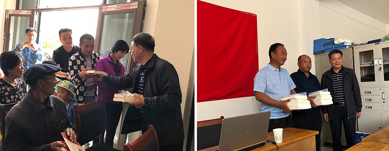 課后,學院領導把《習近平新時代中國特色社會主義思想學習綱要》《習近平新時代中國特色社會主義思想三十講》《全國優秀共產黨員風采錄》《新時代黨支部規范化建設工作實用手冊》和“掃黑除惡”知識手冊等14類50多冊黨建書籍分別贈送給蘆草溝村、尚家臺村黨支部和駐村工作隊,還向聽課的村民黨員贈送《習近平的七年知青歲月》等書籍。進村入戶的幫扶干部向幫扶戶村民黨員贈送了黨建書籍。共贈送100多冊價值2700多元黨建書籍和掃黑除惡手冊。