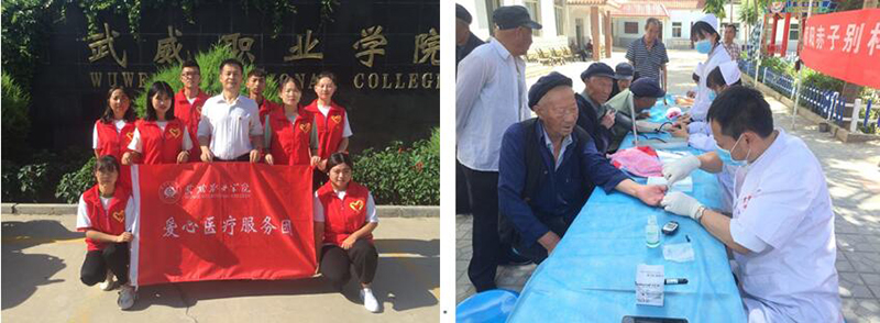 2019年暑假期間,武威職業學院護理系積極響應團中央、院團委對青年大學生暑期“三下鄉”社會實踐活動的號召,組織10名骨干學生成立了“愛心醫療服務團”,7月11始,由指導教師楊棟帶隊趕赴甘肅省武威市涼州區高壩鎮中心敬老院、古浪縣黃花灘鎮綠洲扶貧移民點、武威市涼州區高壩鎮蜻蜓村、武威市黃羊鎮五連扶貧移民點(榮昌村)、武威市涼州區福利路社區、武威市涼州區華閏庭院、武威市社會福利院等多地開展了為期七天的醫療社會實踐活動。