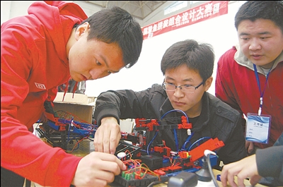 ⑥4月12日,江蘇科技大學舉辦首屆慧魚機器人拼裝組合設計大賽,圖為大學生在進行機器人拼裝比賽。