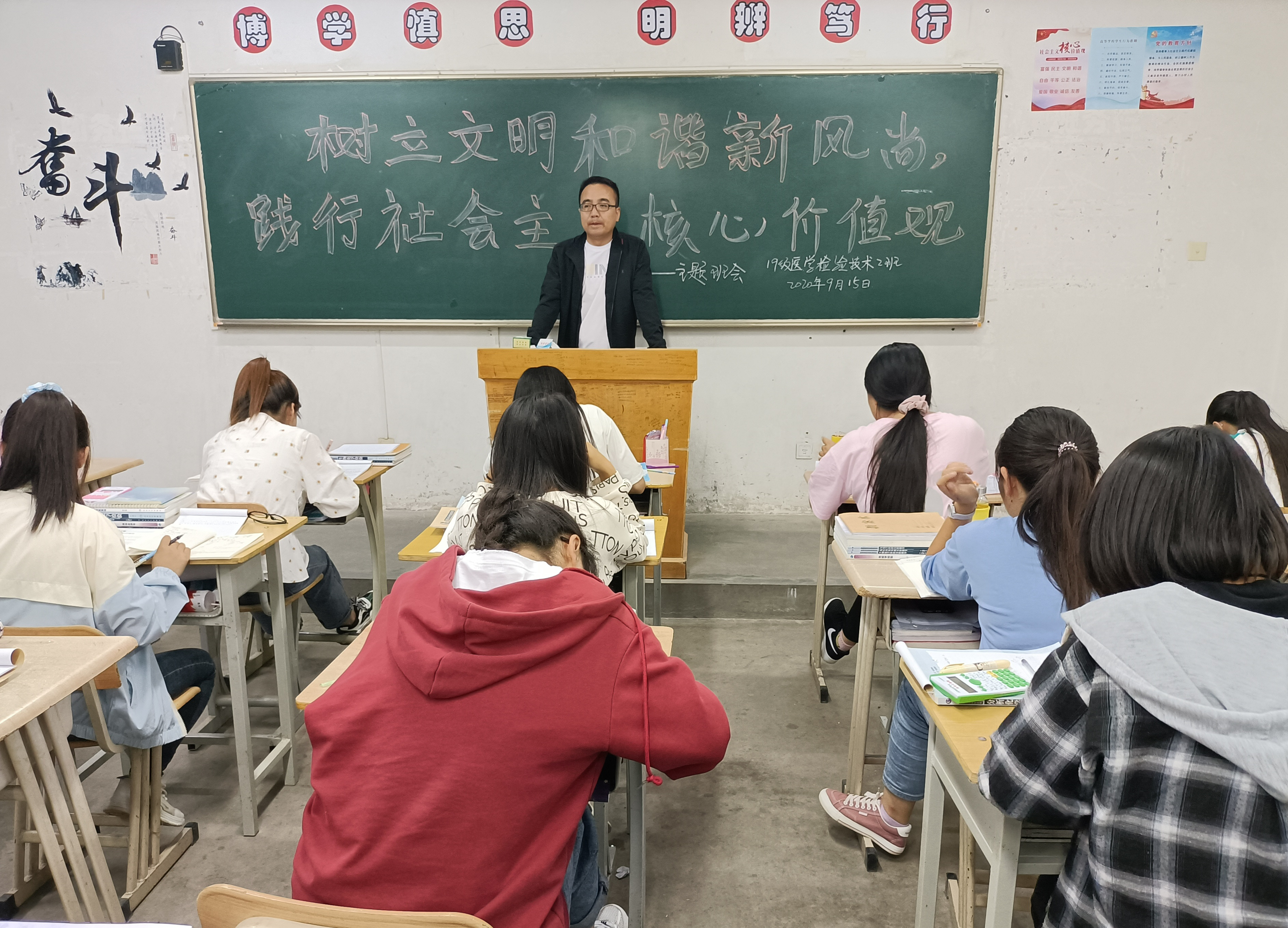 ?為深入學(xué)習(xí)習(xí)近平新時(shí)代中國(guó)特色社會(huì)主義思想和黨的十九大、十九屆四中全會(huì)精神,堅(jiān)決落實(shí)學(xué)院關(guān)于文明校園和文明城市創(chuàng)建的各項(xiàng)安排部署,深入推進(jìn)制止餐飲浪費(fèi)行為系列活動(dòng),團(tuán)結(jié)引領(lǐng)我系師生積極踐行社會(huì)主義核心價(jià)值觀,樹立文明和諧新風(fēng)尚。醫(yī)學(xué)技術(shù)與信息管理系各教學(xué)班于2020年9月15日開展了“樹立文明新風(fēng)尚,踐行社會(huì)主義核心價(jià)值觀”主題班會(huì)教育活動(dòng)。
