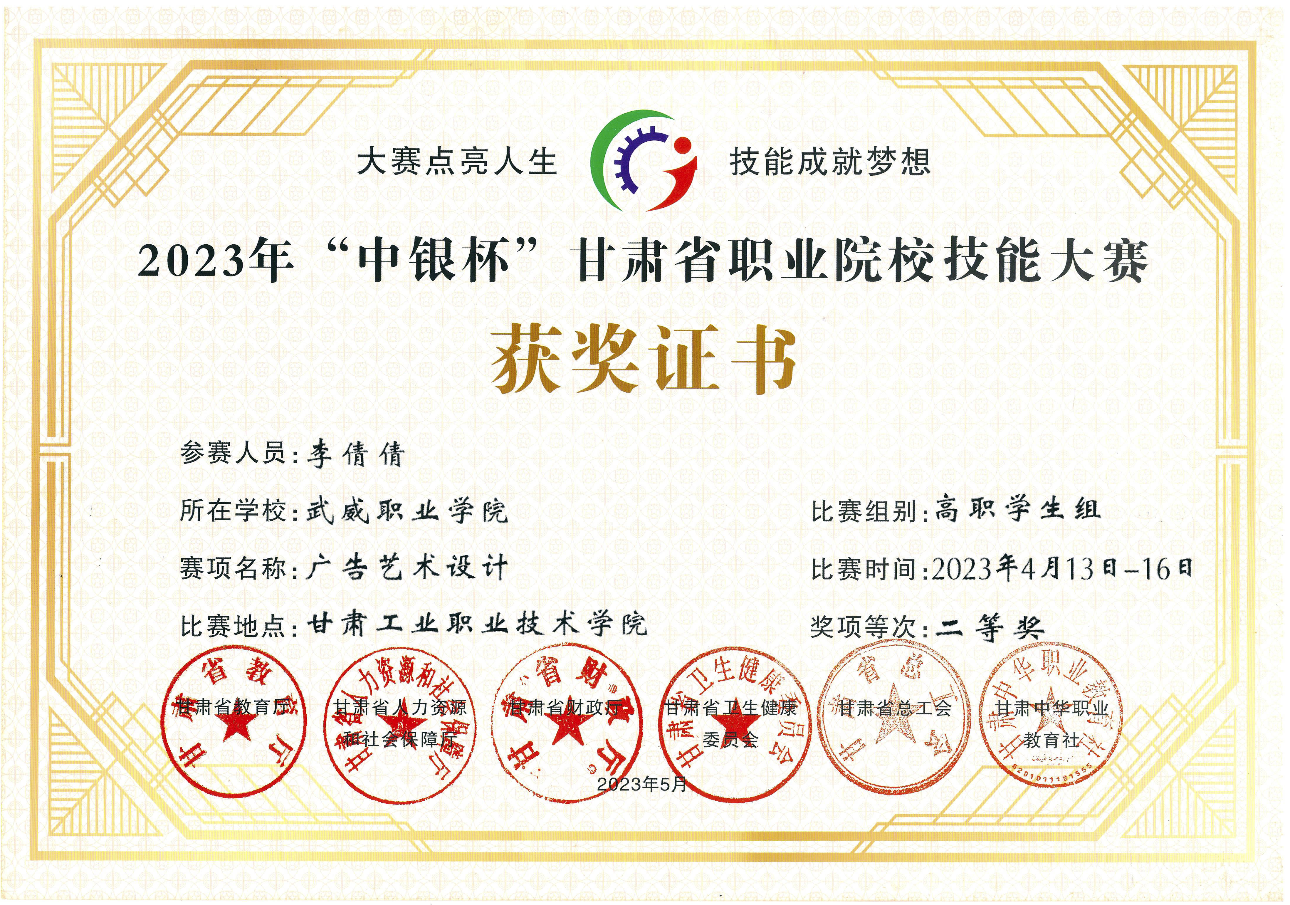 4月14日,2023年“中銀杯”職業院校技能大賽廣告藝術設計賽項在甘肅工業職業技術學院舉辦,我院2020級動漫設計大專班學生李倩倩、2020級數字媒體藝術設計大專班馬阿旦參加比賽。經過4個小時比賽,李倩倩榮獲二等獎,何曉琴老師獲得優秀指導教師。