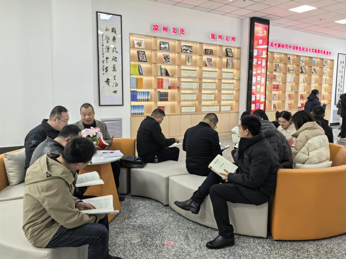 黨員們圍坐在書架旁,認真閱讀關于習近平新時代中國特色社會主義思想書籍。書籍涵蓋了黨的創新理論、實踐探索、歷史經驗等多方面內容。閱讀結束后,全體黨員在研討交流室集中觀看了視頻《中國共產黨人精神譜系》,并開展了研討。
