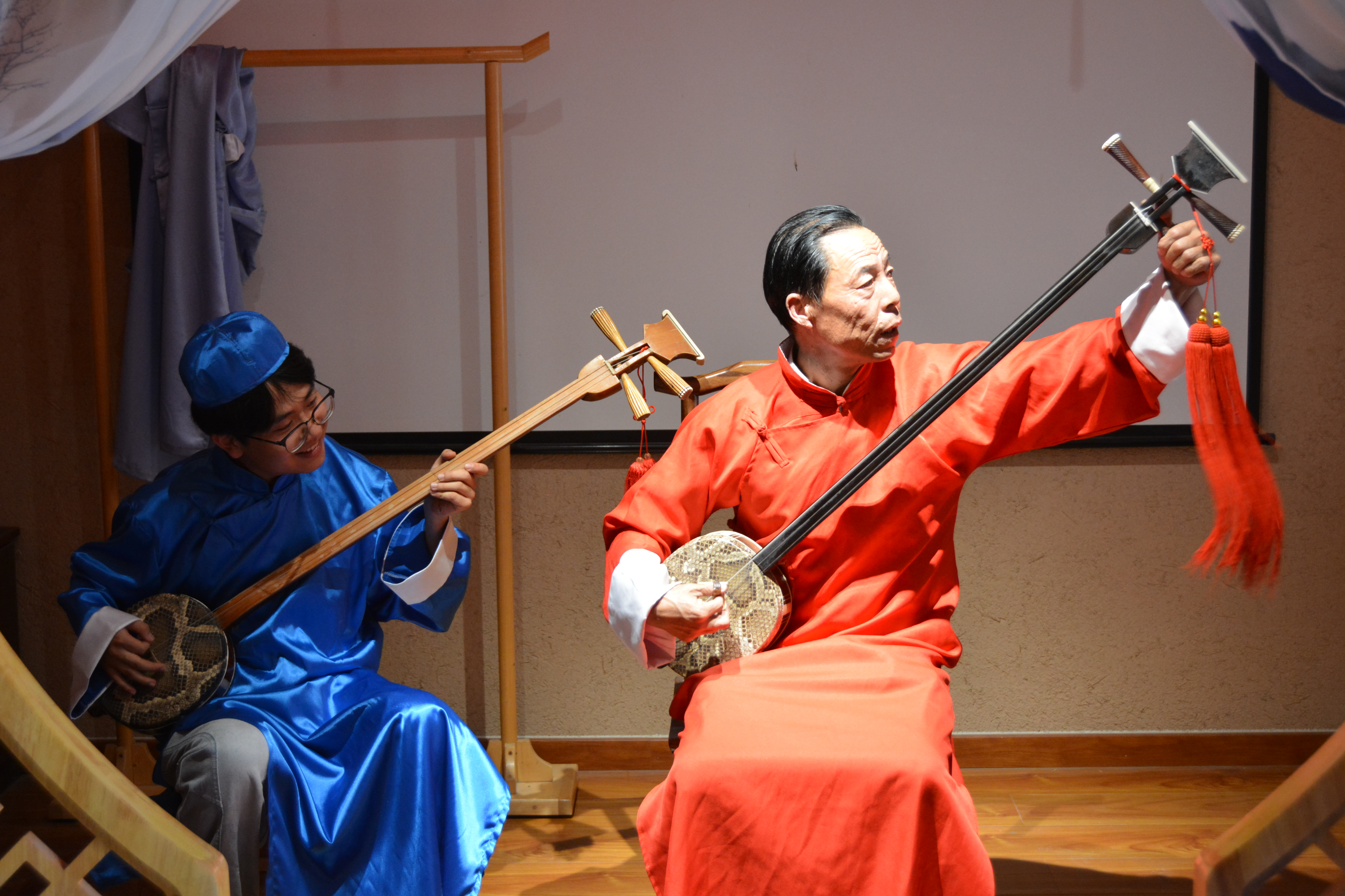 非遺民俗文化館當天化身成為一座流動的非遺課堂,實踐團成員們圍坐在古樸的庭院中,聚精會神地聆聽當地資深賢孝藝人董永虎老師深情演繹的經典曲目。老藝人蒼勁而富有穿透力的嗓音,伴著三弦琴弦的顫動,將一段段蘊含忠孝節義、勸人向善的古老故事娓娓道來。那飽經歲月洗禮的曲調,仿佛穿越時空,在青磚黛瓦間回蕩,讓在場的每一位學子都深深沉浸其中,體味著這門古老說唱藝術所承載的歷史重量與人文溫度。