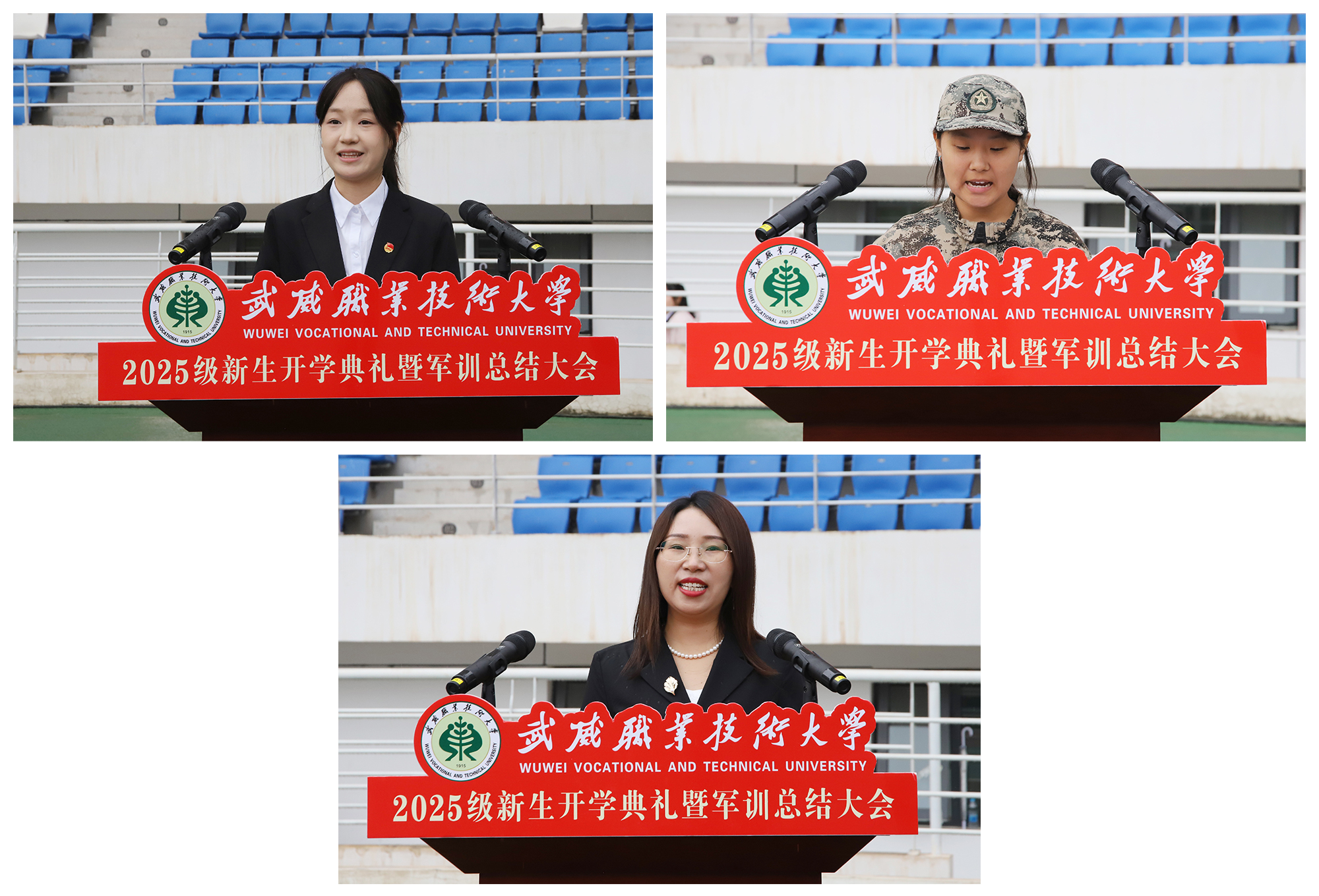新生代表信息技術學院2025級物聯(lián)網(wǎng)本科專業(yè)學生胥媛,教師代表2025年武威市優(yōu)秀教師、護理學院王艷麗,在校生代表藝術與教育學院2023級學前教育專業(yè)潘怡彤先后發(fā)言,分享了她們各自在工作、學習中的心得,勉勵大家要樹立遠大理想、始終追求卓越、保持軍訓底色、珍惜求學時光,不負青春、不負時代。