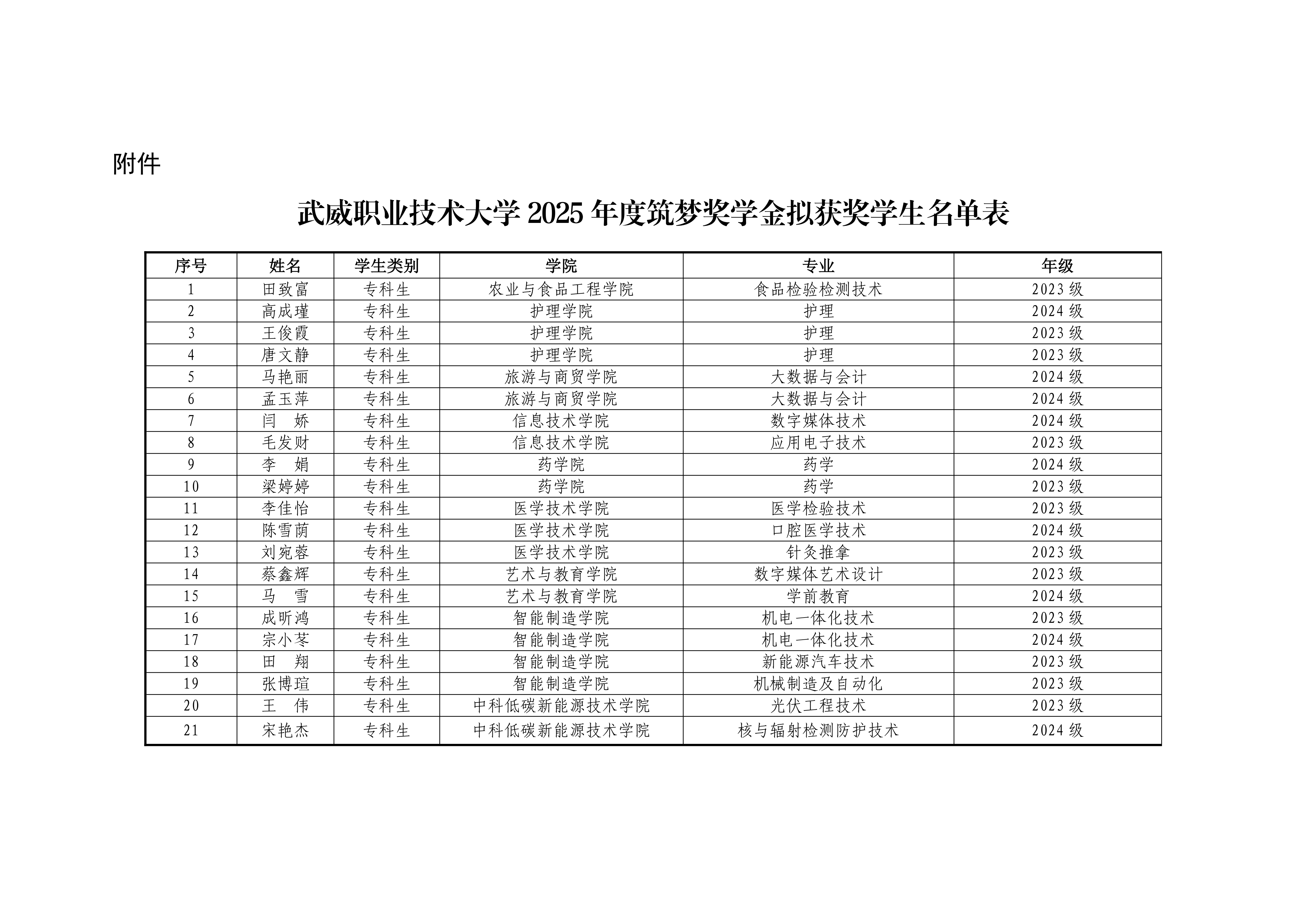 武威職業技術大學關于2025年度筑夢獎學金評選結果的公示