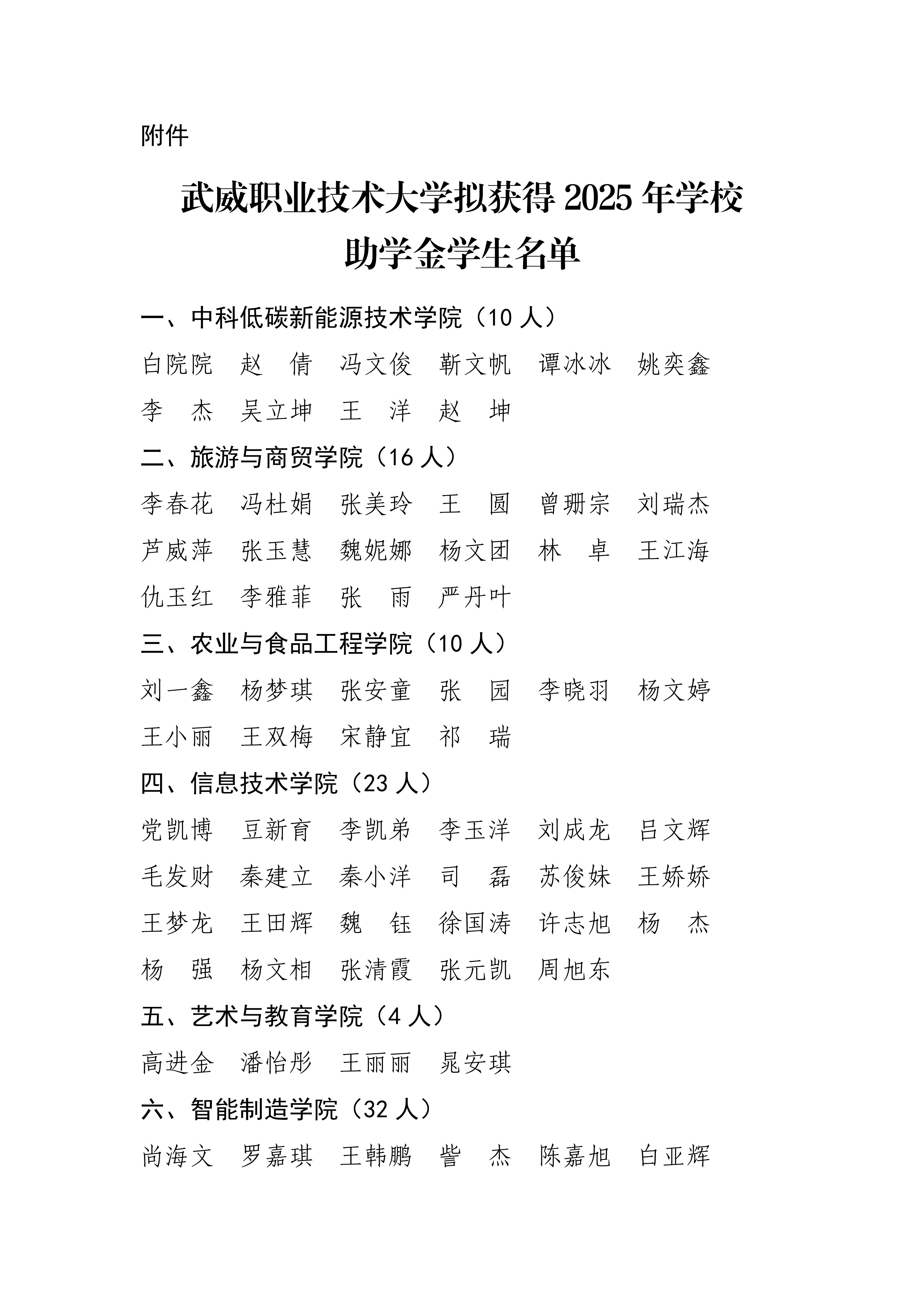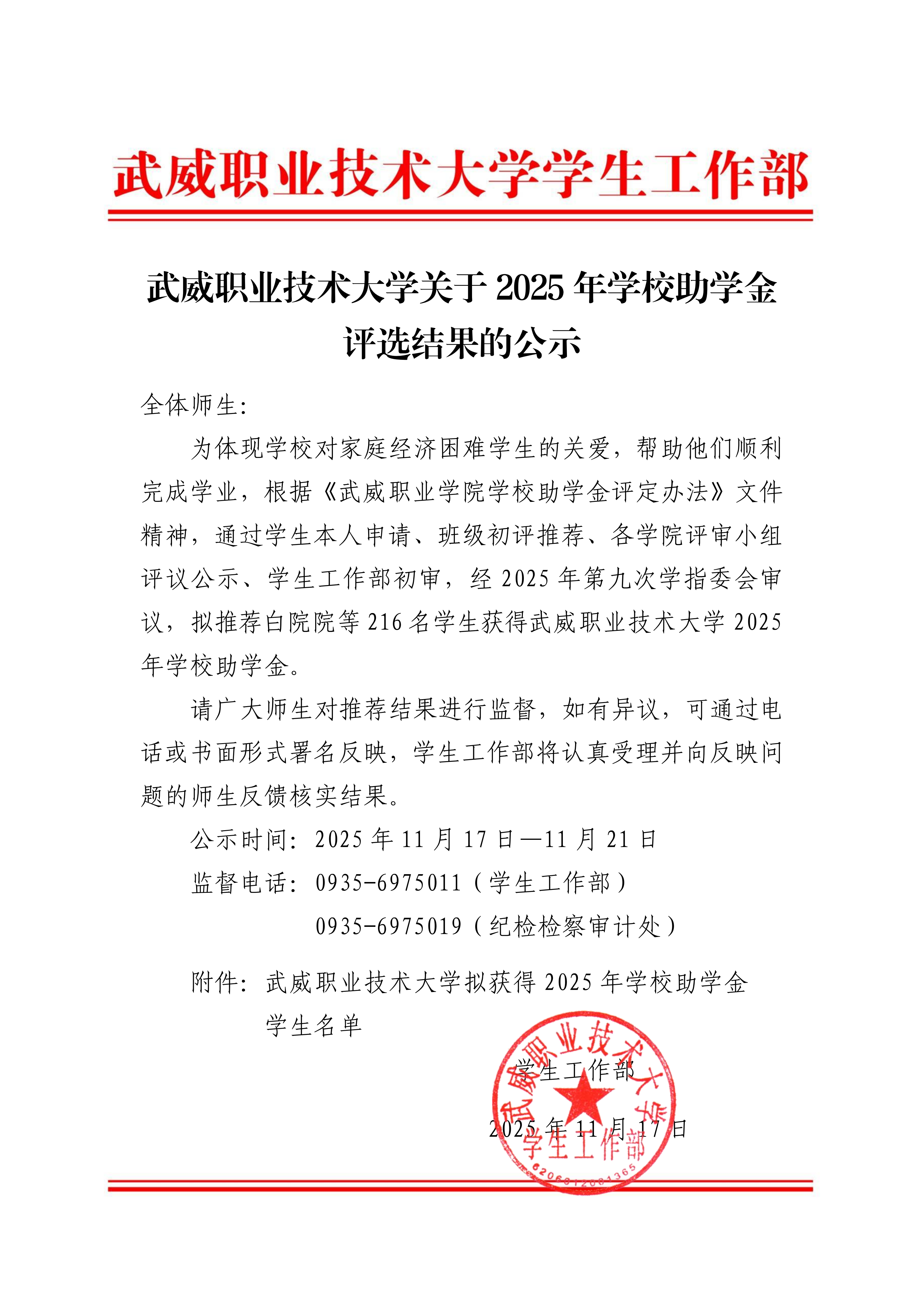 武威職業技術大學關于2025年學校助學金評選結果的公示