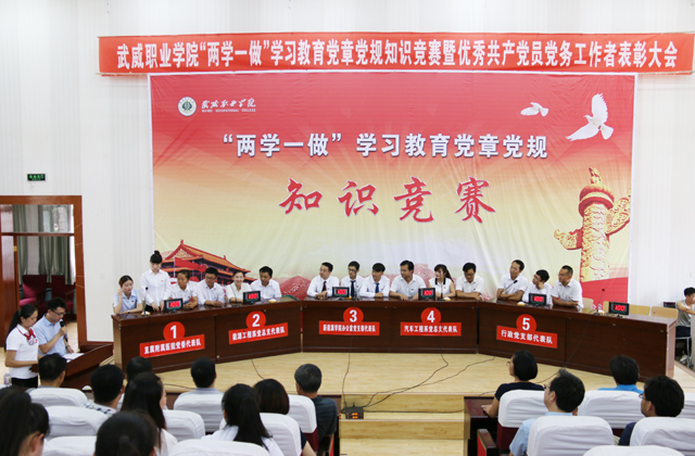7月6日下午,武威職業學院“兩學一做”學習教育黨章黨規知識競賽暨優秀共產黨員、優秀黨務工作者表彰大會在尚德樓正德廳召開。黨委書記張國民,黨委副書記趙明,紀委書記張富國,副院長翟存祥、王永緒、潘玉華、田迎春出席會議。直屬附屬醫院黨委主要負責同志、各黨總支(直屬黨支部)書記,各部門負責人,受表彰的優秀共產黨員、優秀黨務工作者以及參加競賽的代表隊成員共270人參加了知識競賽活動和表彰大會。表彰大會由黨委副書記趙明主持。